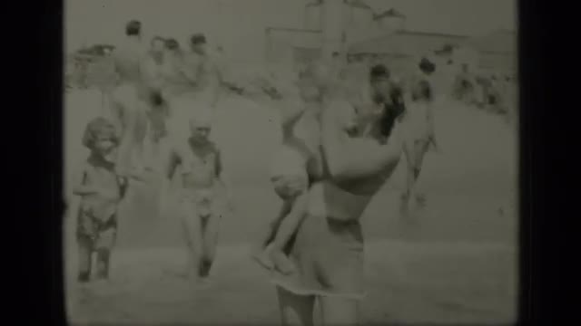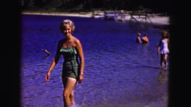 > 1965: woman sunbathing in a bikini and children jumping and playing in the ocean waves HAWAII