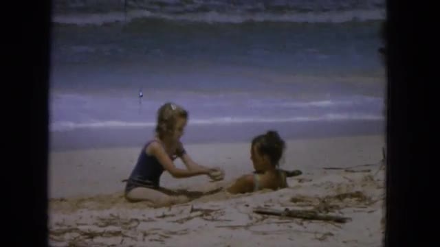 > 1965: a woman and a child playing in the sand on the beach HAWAII