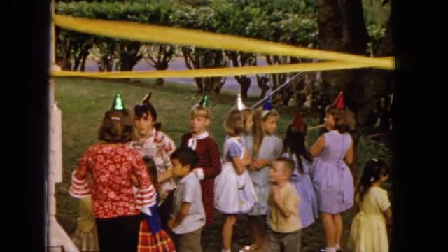 > 1965: child's birthday party with kids standing in line HAWAII