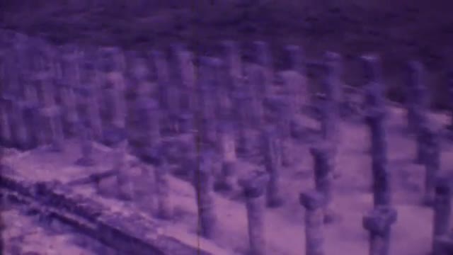1973: people walking among many columns and statues in a valley surrounded by hills MEXICO