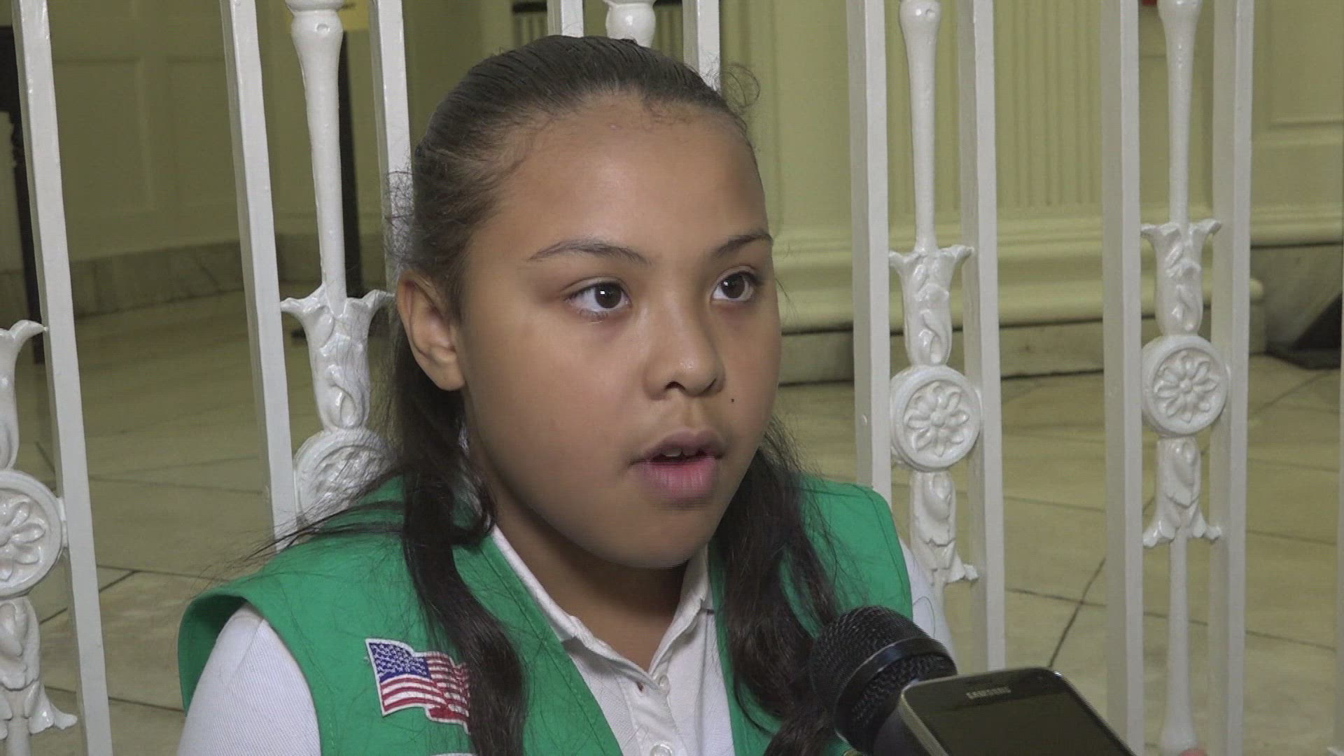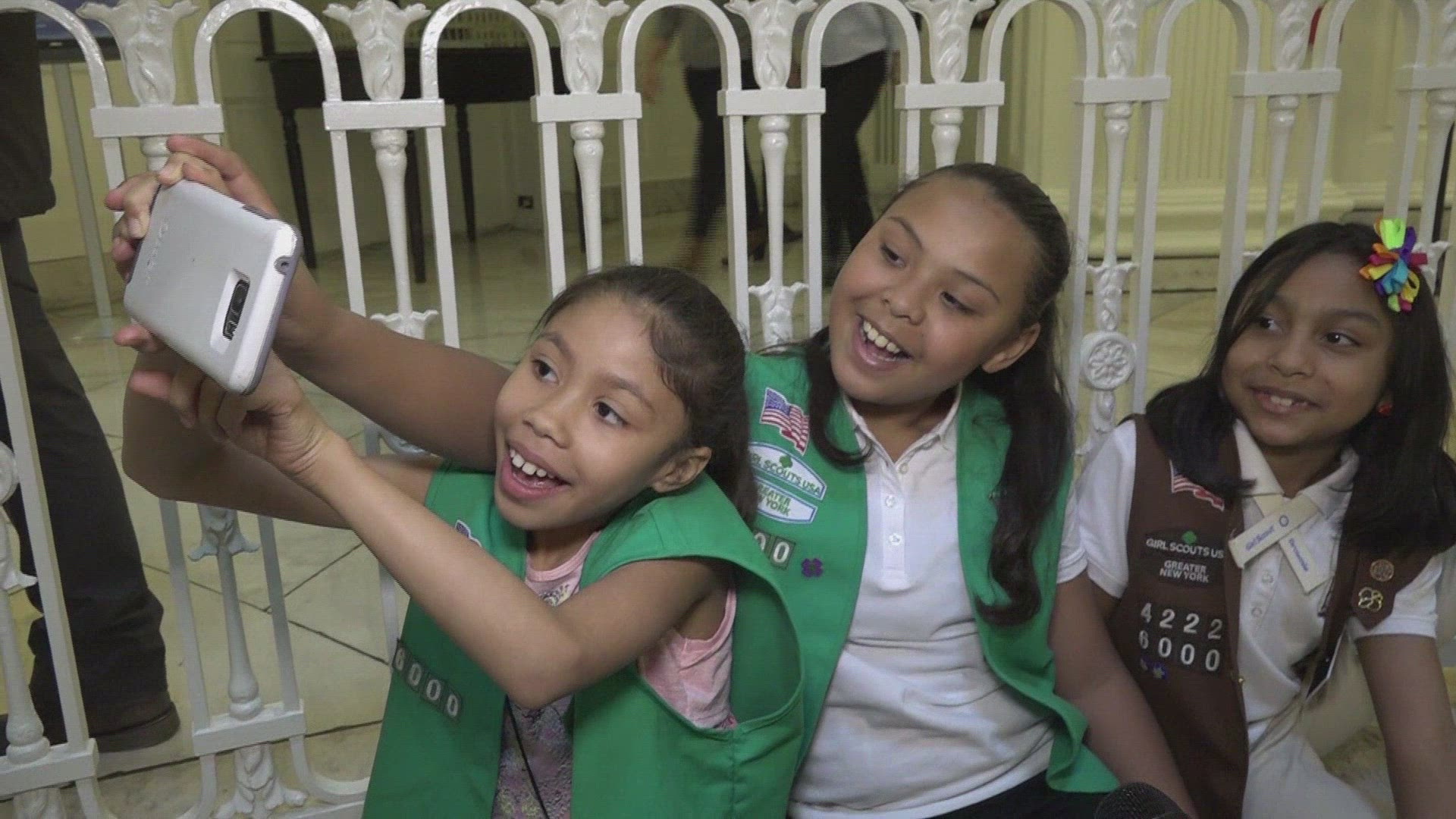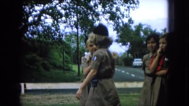 > 1966: parents and girls in girl scout or brownie uniforms gathered indoors CALIFORNIA
