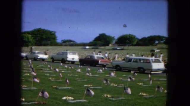 > 1966: cemetery with many cars for memorial service or funeral CALIFORNIA