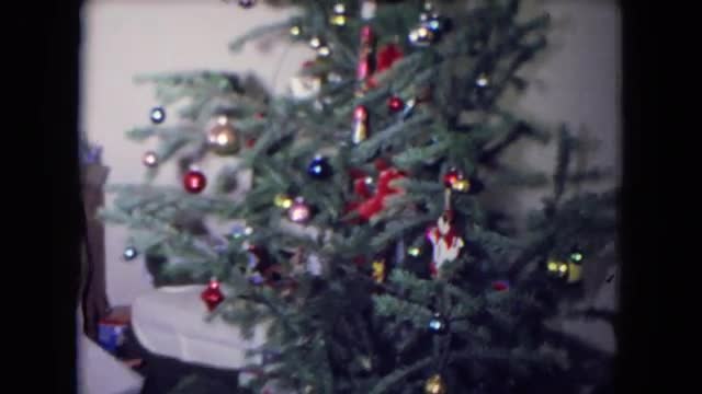 > 1969: girl opening a present under a christmas tree NEW YORK