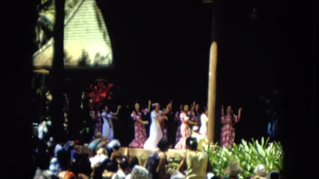 > 1966: women on stage in costumes performing a hula dance for an audience HAWAII