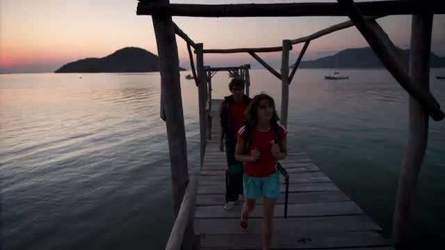 Young Tourists Couple of Lovers on Forest Lake. Autumn Leaf Fall Sunny Day. Background Water Yellow