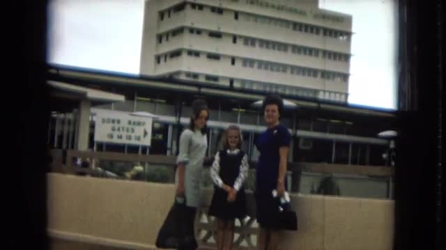 > 1967: woman and two girls pose by wall in front of airport terminal and building HAWAII