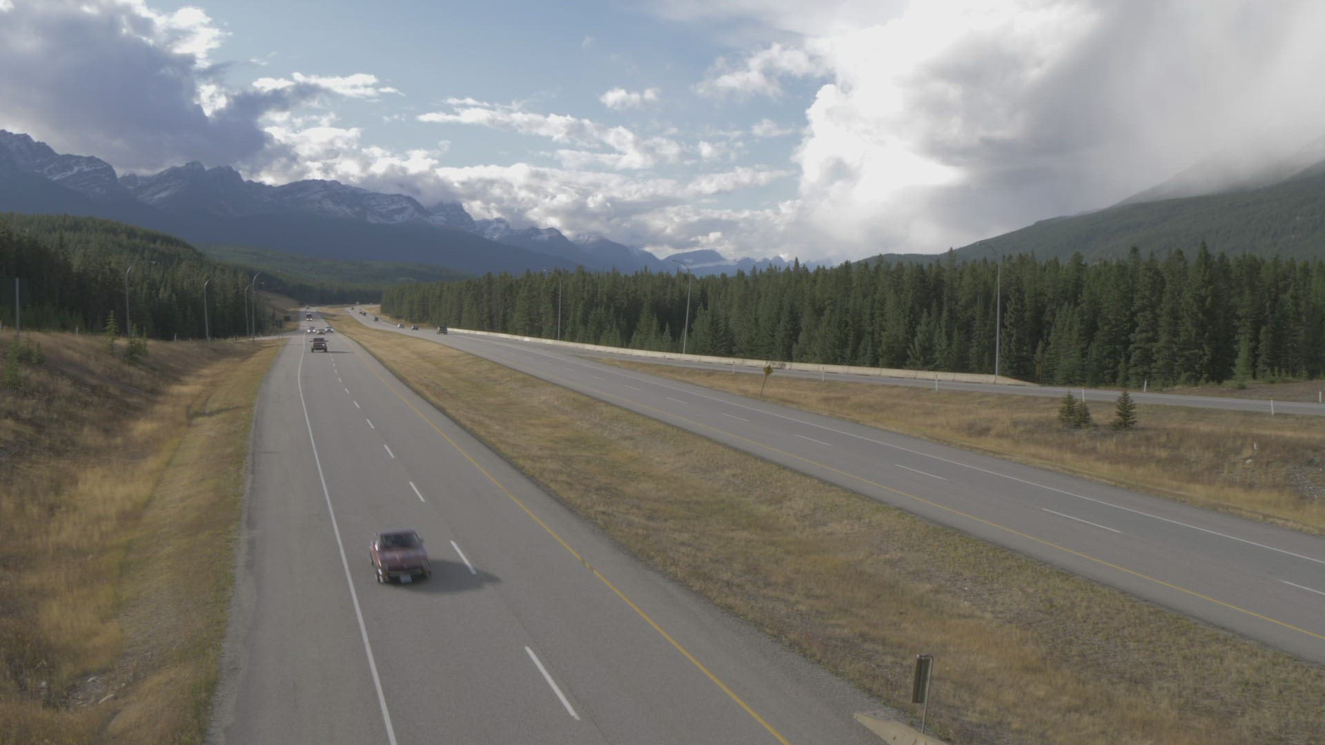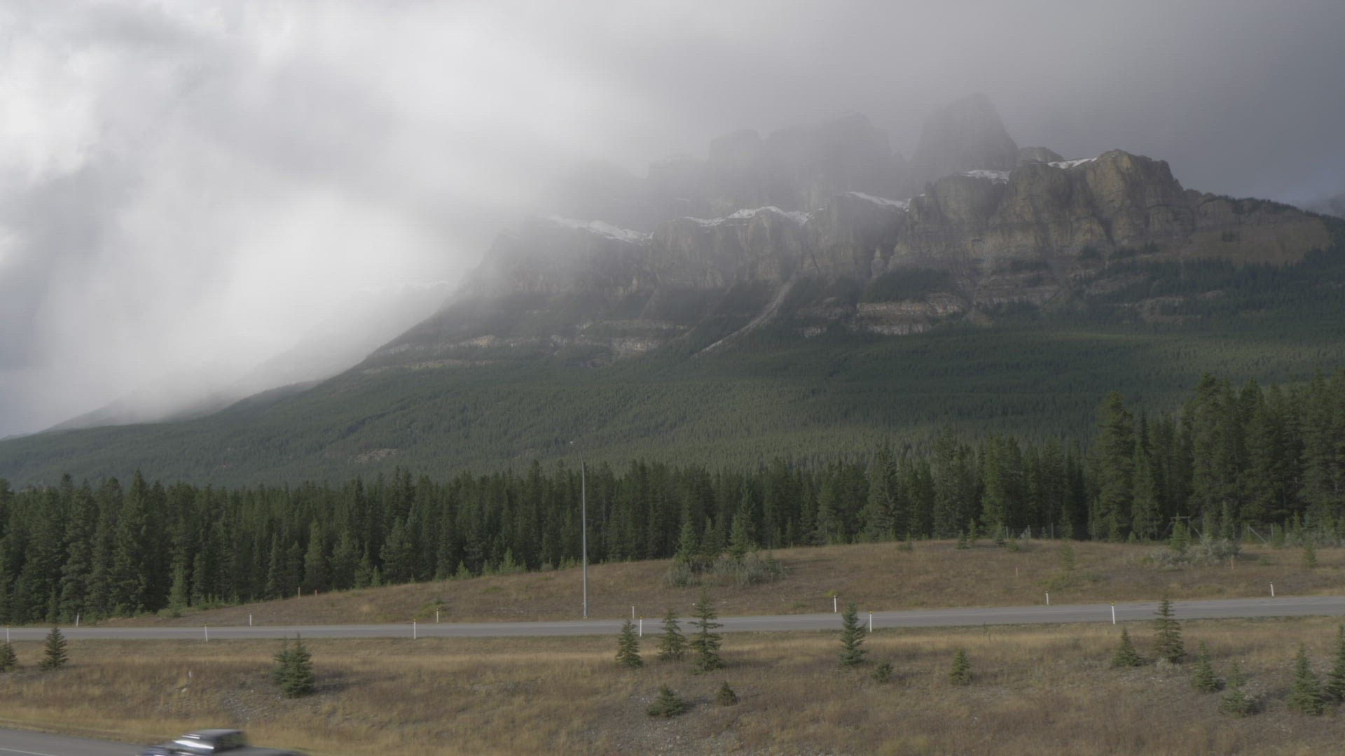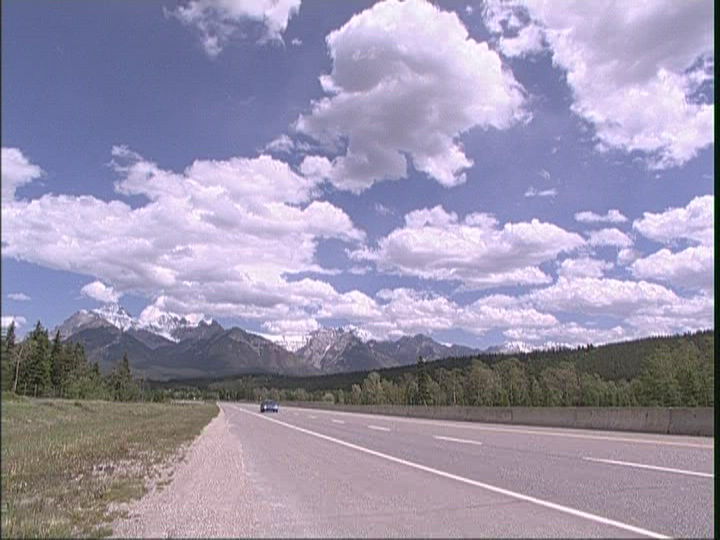 > 1967: a car driving down the highway with rugged , rocky mountains on either side ARIZONA