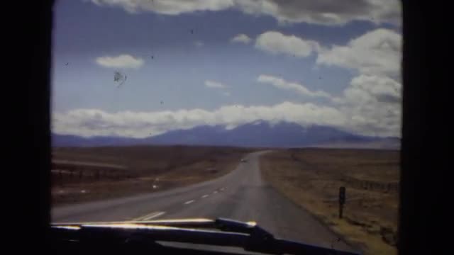 > 1967: view from a moving vehicle along a lonely desert road passes another vehicle ARIZONA