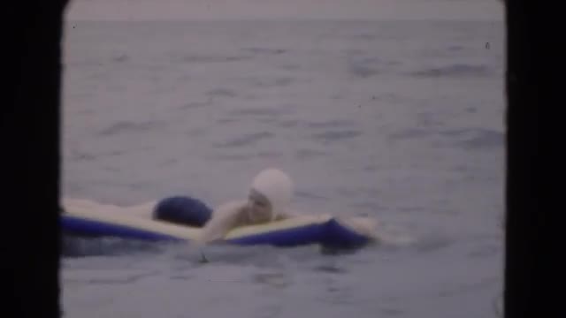 > 1951: a woman in a white swimming cap in the ocean, climbing onto a raft FLORIDA