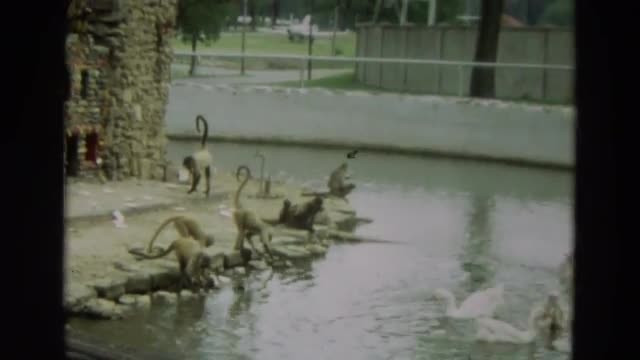 > 1965: long tail monkeys playing around archeological building while swans swim in the water OMAHA, N