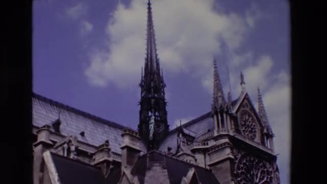 1969: the top of a very ornate church with angels and lots of architectural details PARIS, FRANCE