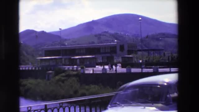 > 1969: a building and mountains as seen across the water on a bridge LOURDES, FRANCE