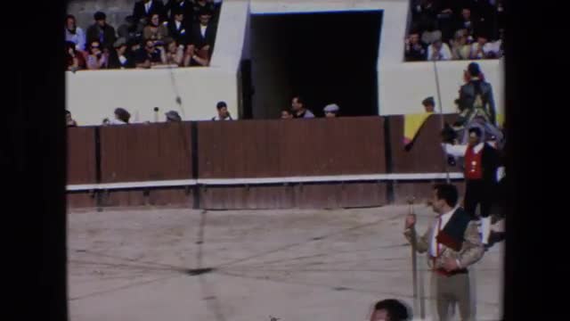 > 1971: riders are showing off their horsemanship at a bullfighting arena with many spectators SPAIN