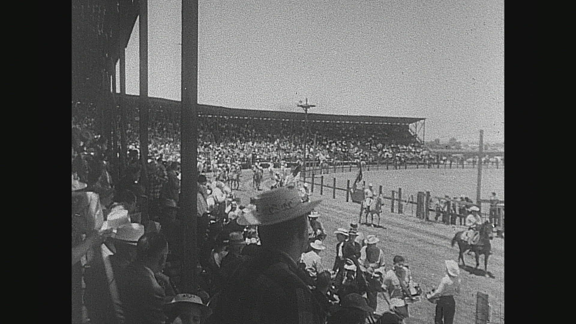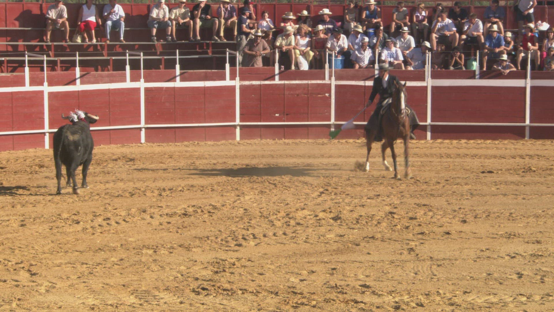 > 1971: a bull chasing a man with a flag on a horse around a ring SPAIN