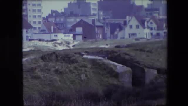 > 1967: large building on a hill grass in front stone structure with houses in the back CALAIS,FRANCE