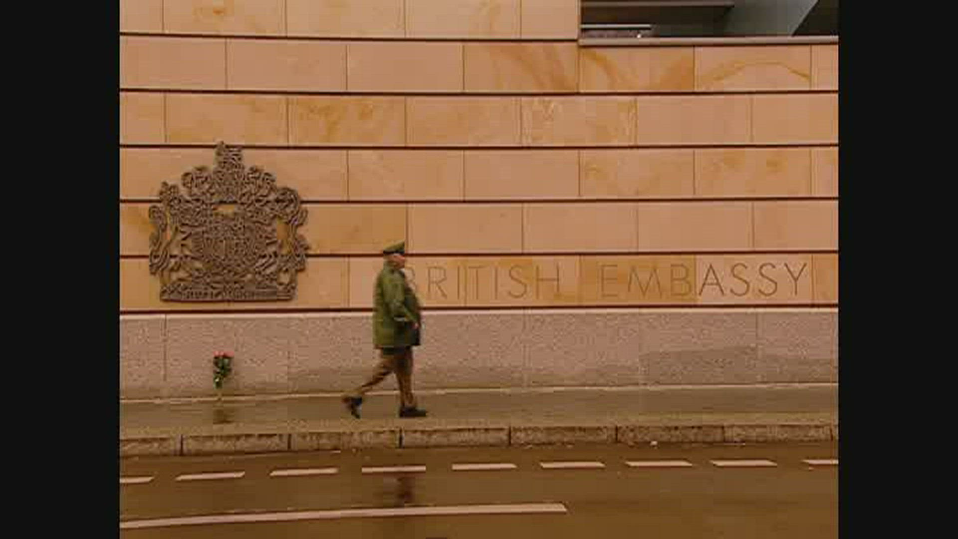 > 1969: a british policeman walks down a city street while two horse mounted policemen ride behind him