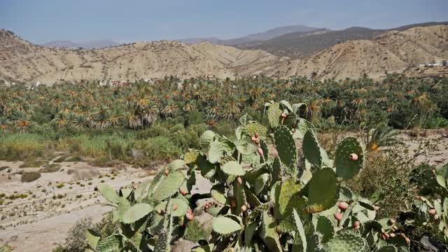 Shot of a cactus with palms in the background.