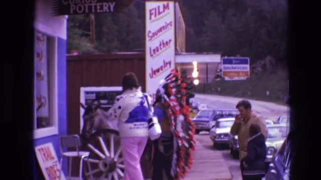 > 1974: man in traditional native american headdress speaks with man on horse by the street SOUTH DAKO