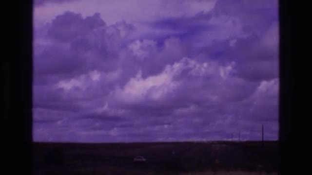 1973: a car is driving off into the horizon which is filled with clouds over a flat terrain NEW MEXI