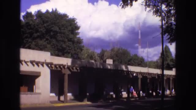 > 1973: building with many pillars people walking alongside NEW MEXICO