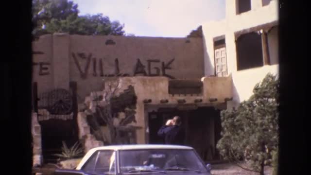> 1973: an old, rustic building with the words santa fe village across the front NEW MEXICO