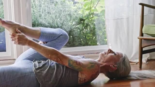 Mature Caucasian woman relaxing in living room reading a book