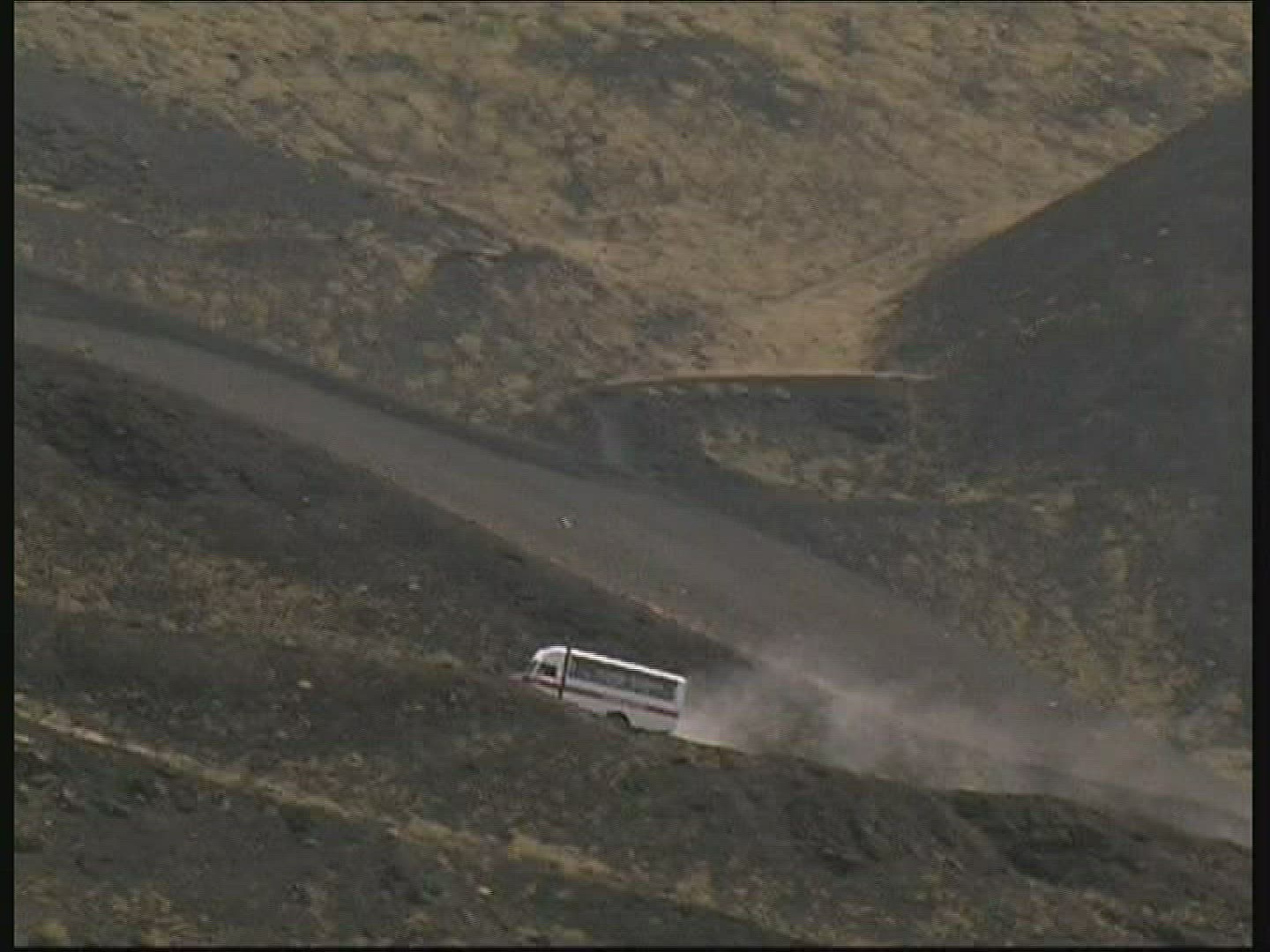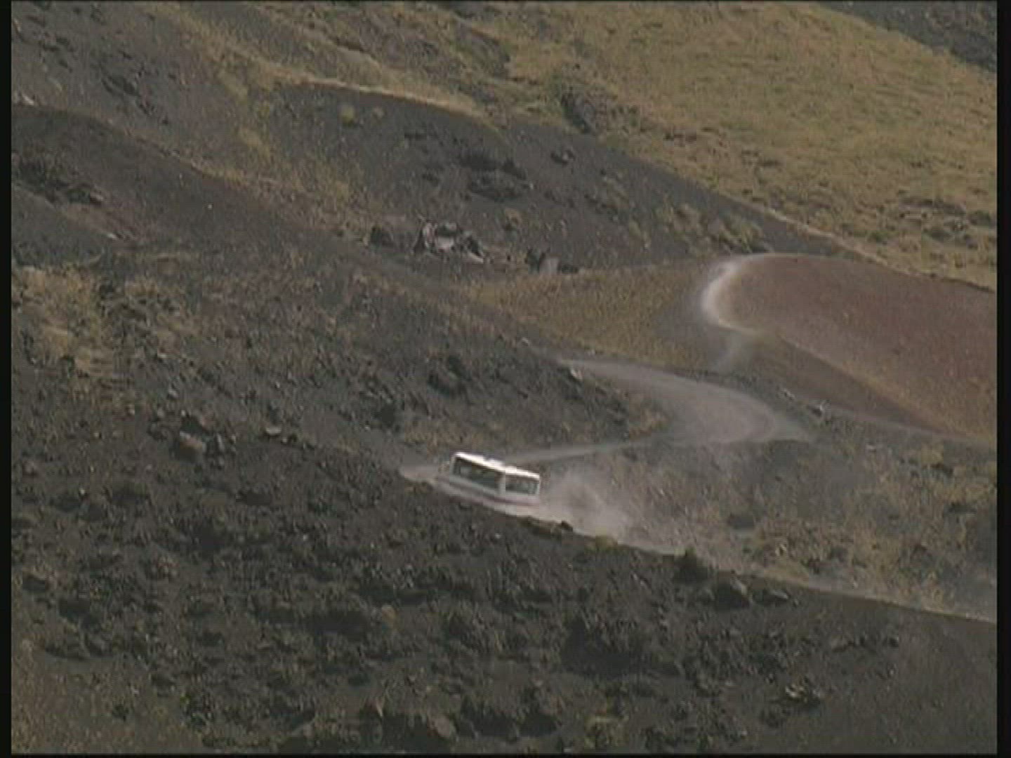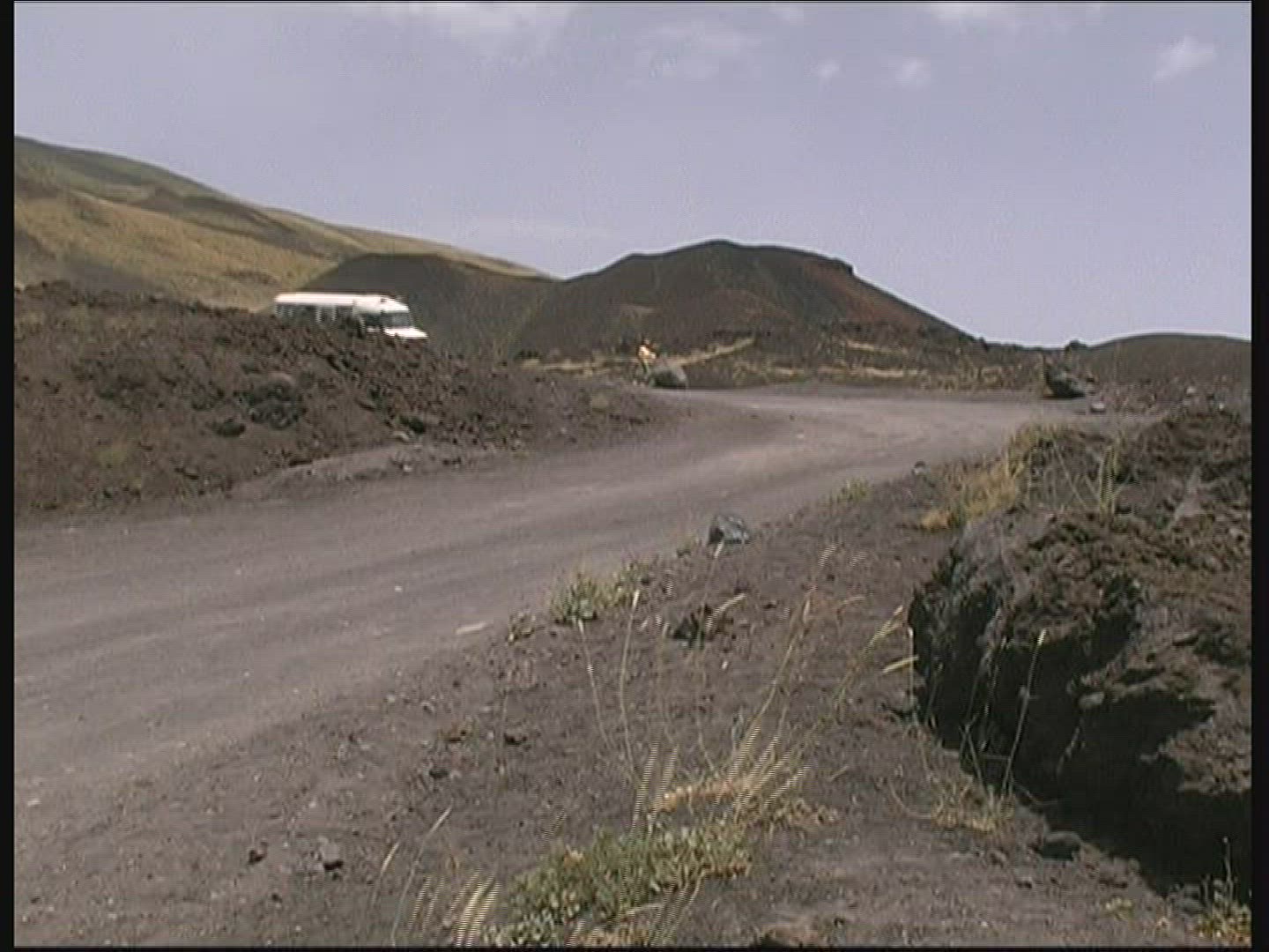 > 1968: traveling on a dirt road out of a rock walled canyon or tunnel into a mountain forest of green