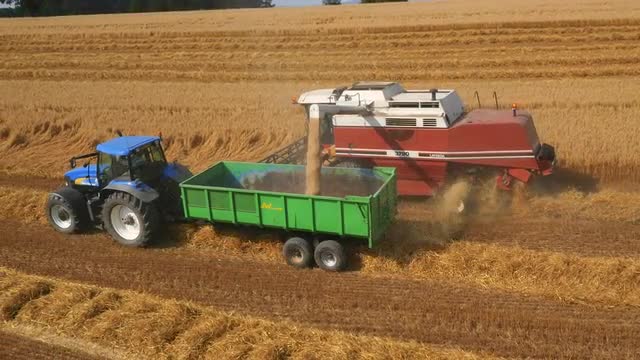 > Aerial drone footage of Fiatagri Laverda unloading barley, UK