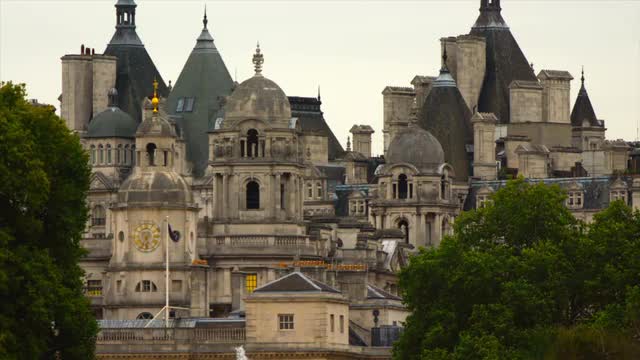 > 1969: spires top an old building with mounted statues and lower-level windows protected with iron ca