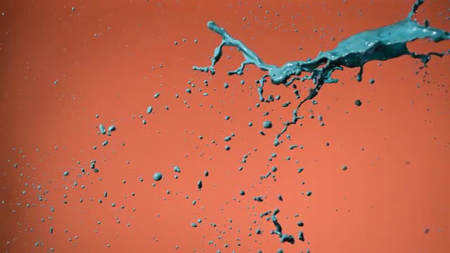 Blue paint catapulted across frame against an orange background.