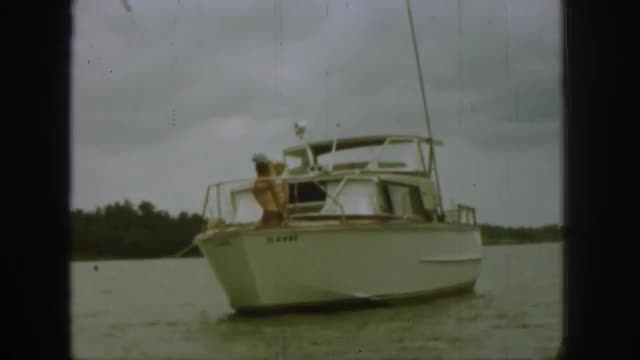 1961: ship sailing in water people sitting inside trees on the bank man with child standing on the s