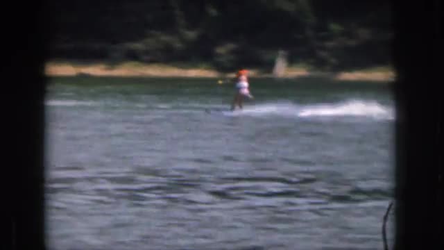 > 1961: waterskiing down a calm river at daytime MICHIGAN