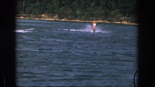 > 1961: a man is skating in the water pulled by a speed boat MICHIGAN