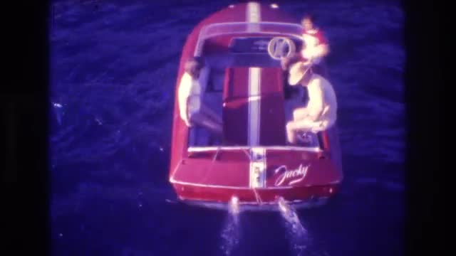 > 1982: three people riding in a small red boat ACAPULCO MEXICO
