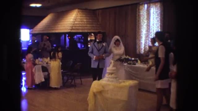> 1974: marriage party bride and groom holding hand walking people enjoying having fun beautiful eveni