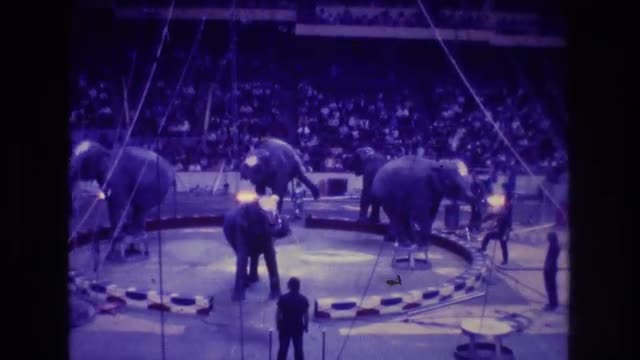 1974: group of four elephants dancing in a circle in front of a crowd in a circus BOSTON