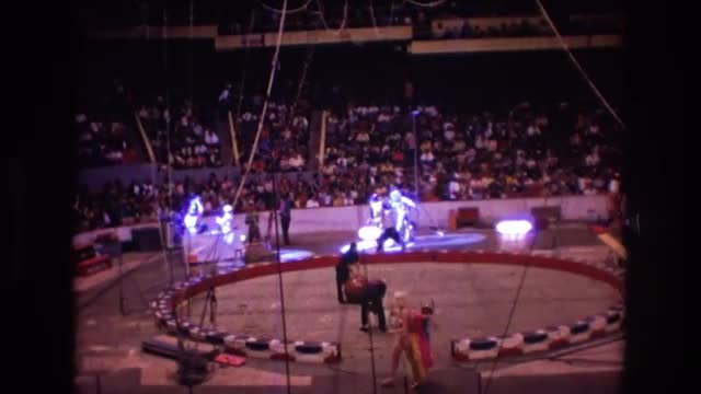 1974: performers entertain a crowd while two men in the middle set up the next act. BOSTON
