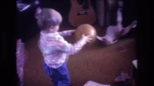 > 1975: cute child indoor playing and throwing a ball BAXTER MAINE