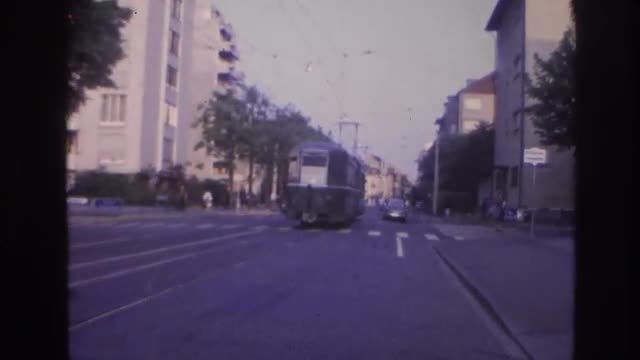 > 1967: some traffic on road with a tram moving on the opposite side. FRANCE