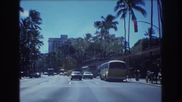 > 1977: driving down the road and stopping at a red light surrounded by palm trees and people HONOLULU