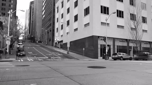 1967: many cars moving through a busy intersection in the city with buildings in the background PARI