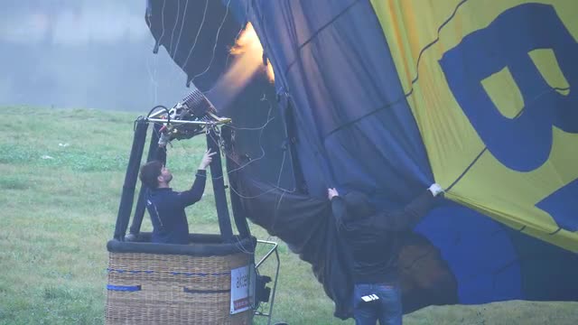 Opole/poland - Oct 22 2016: Three Men Before the Flight Check Equipment Balloon. People in the Basket Ignite the Burner. it Rises up Yellow Flame. Then the Man Climbs Out of the Basket. Against the Backdrop of the City. Event: Ballooning on Halloween in Opole. Beside River Oder. Flight in a Balloon. Autumn Day