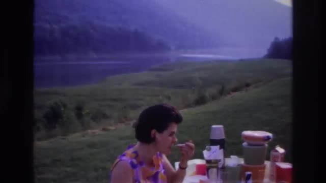 1967: a woman eating at a picnic table with a stunning natural background OTTAWA CANADA