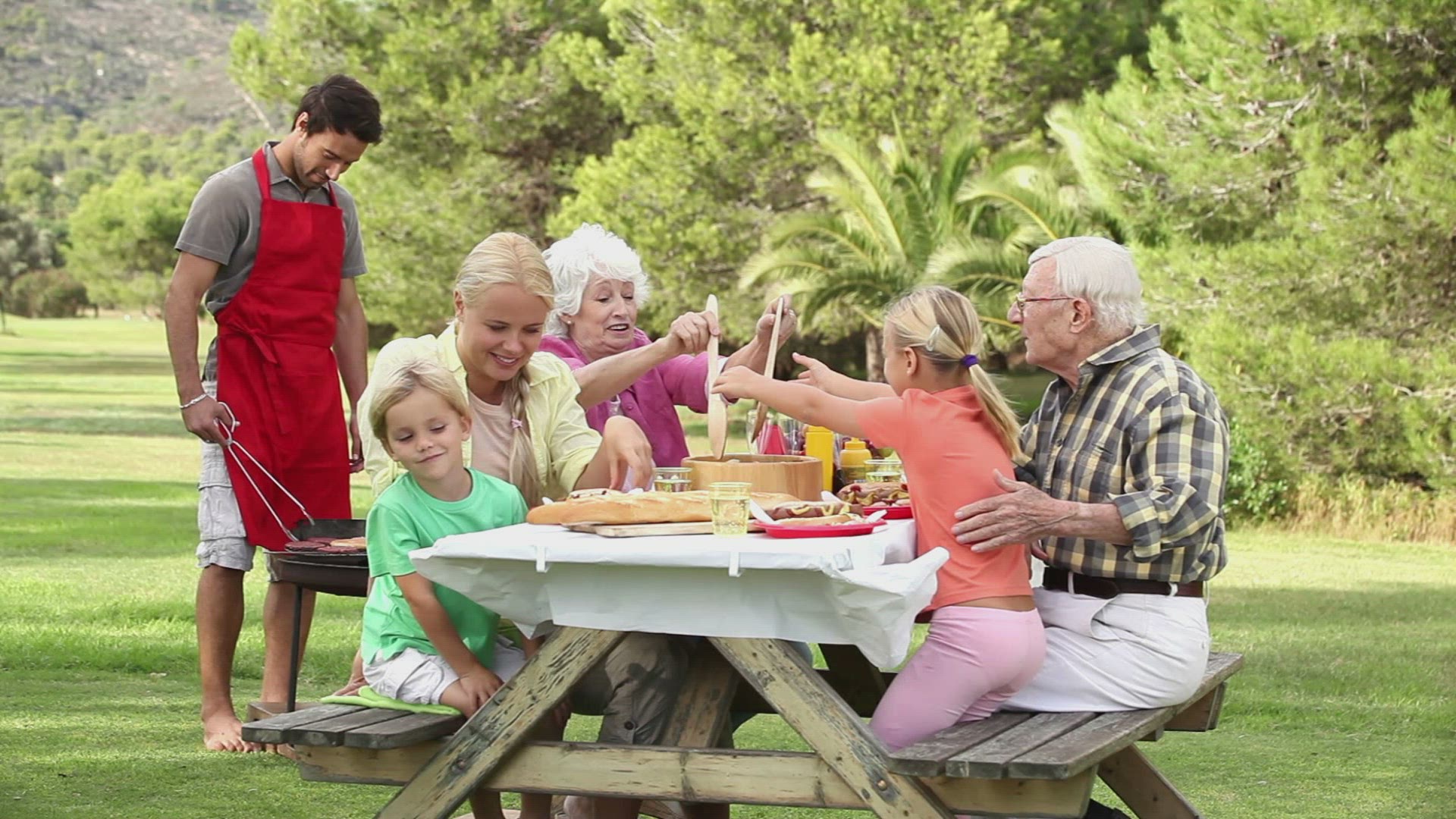 > 1967: picnic of three persons on a bench and table, couple is kissing, enjoying the food on a nice d