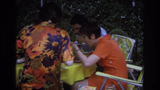 1967: picnic of three persons on a bench and table, couple is kissing, enjoying the food on a nice d