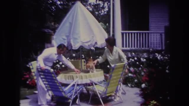 > 1967: a couple is playing with a cat on the table ROCKAWAY BEACH NEW YORK