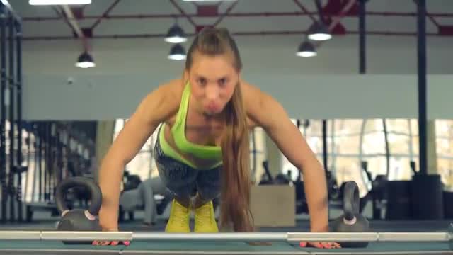 She Pushed Off the Floor Looking Straight Into the Camera. in the Foreground of the Neck From the Rod and Metal Weights. Girl Athletic Training in the Gym. Dressed in Colorful Sportswear. Yellow Topic, Form-Fitting Tights and Yellow Sneakers. Long Hair is Collected in a Ponytail on Her Head. Long Hair is Developed by Repeating the Movement of the Girl. in the Background, a Gym With Exercise Equipment and a Rubber Coating. Lighting Soft Day, as Well as an Additional Source of Scattered Light