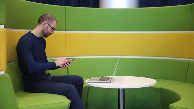 677596 - Bald man with glasses working on laptop with phone