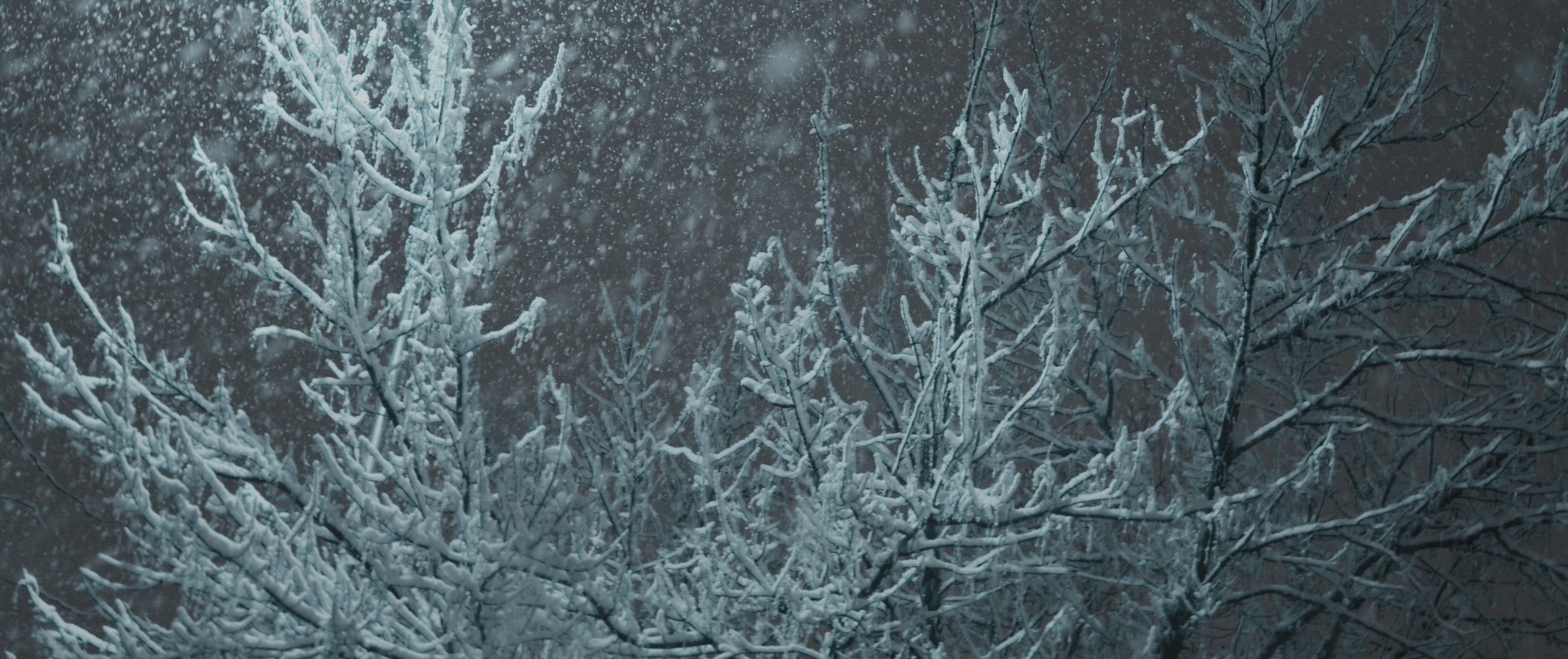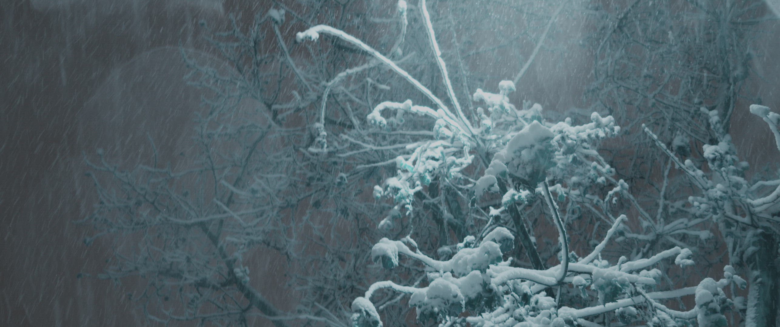 1050397 - Snow falling in front of tree covered in frost