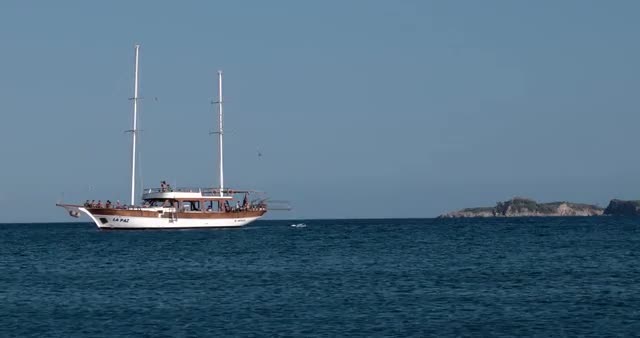 Turkish Style Gulet Yacht Anchored in the Bay of Mediterranean Sea With Island on Background